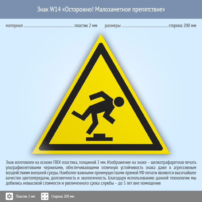 Знак W14 «Осторожно! малозаметное препятствие» (пластик, сторона 200 мм) в Омске купить