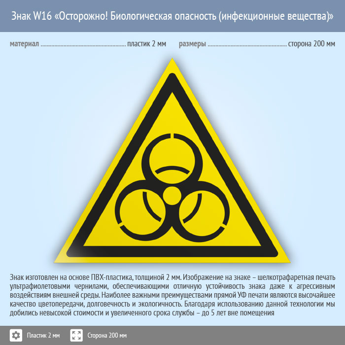 Знак W16 «Осторожно! биологическая опасность (инфекционные вещества)» (пластик, сторона 200 мм) в Омске купить