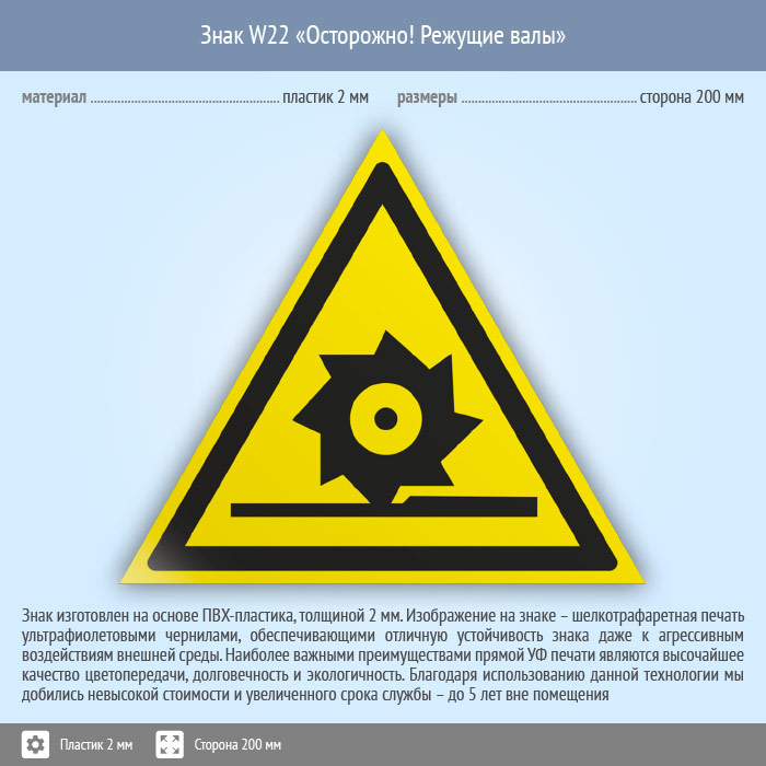 Знак W22 «Осторожно! режущие валы» (пластик, сторона 200 мм) в Омске купить