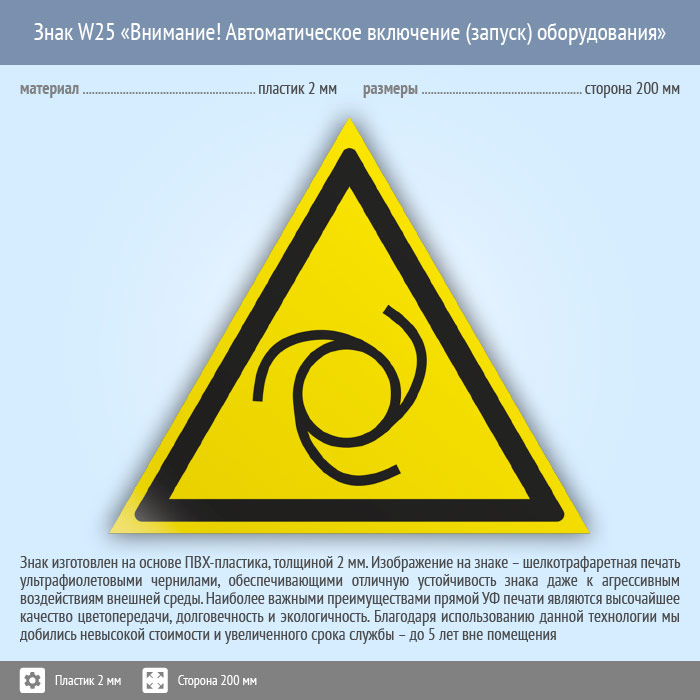 Знак W25 «Внимание! автоматическое включение (запуск) оборудования» (пластик, сторона 200 мм) в Омске купить