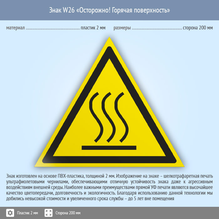 Знак W26 «Осторожно! горячая поверхность» (пластик, сторона 200 мм) в Омске купить