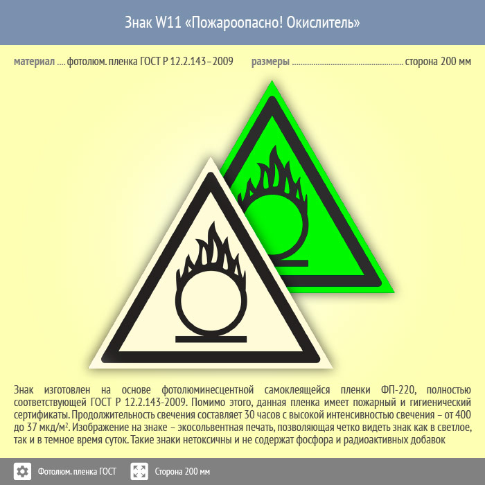 Знак W11 «Пожароопасно! окислитель» (фотолюминесцентная пленка ГОСТ 34428-2018, сторона 200 мм) в Омске купить