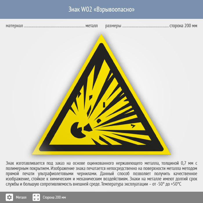 Знак W02 «Взрывоопасно» (металл, сторона 200 мм) в Омске купить