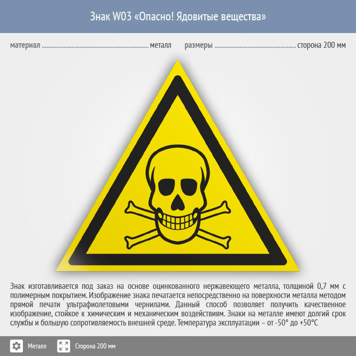 Знак W03 «Опасно! ядовитые вещества» (металл, сторона 200 мм) в Омске купить