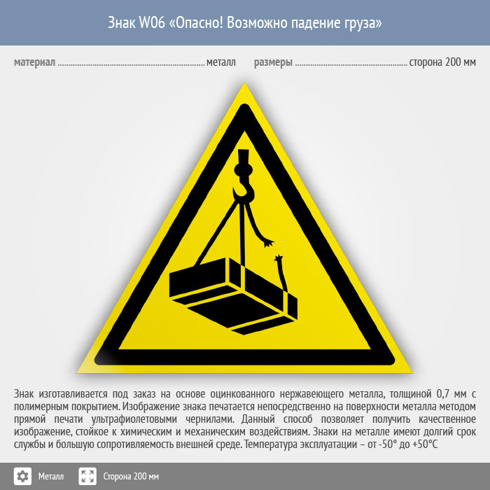 Знак W06 «Опасно! возможно падение груза» (металл, сторона 200 мм) в Омске купить
