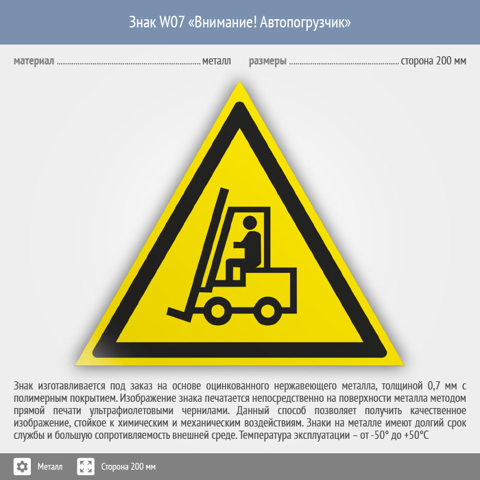 Знак W07 «Внимание! автопогрузчик» (металл, сторона 200 мм) в Омске купить