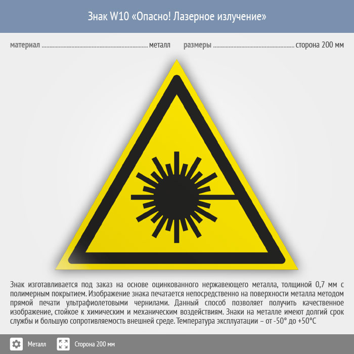Знак W10 «Опасно! лазерное излучение» (металл, сторона 200 мм) в Омске купить