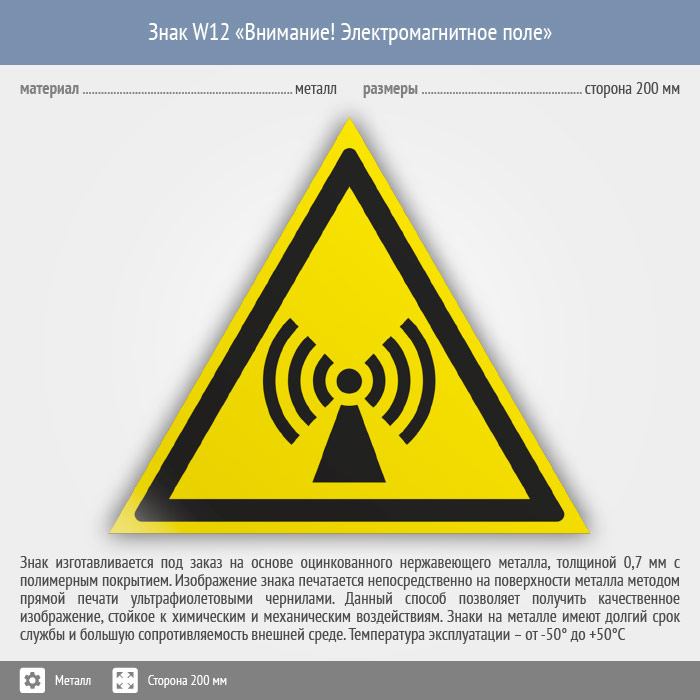 Знак W12 «Внимание! электромагнитное поле» (металл, сторона 200 мм) в Омске купить