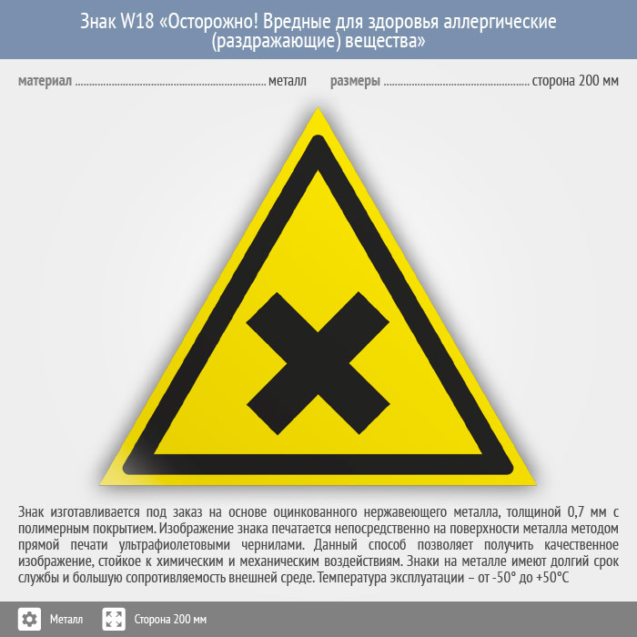 Знак W18 «Осторожно! вредные для здоровья аллергические (раздражающие) вещества» (металл, сторона 200 мм) в Омске купить