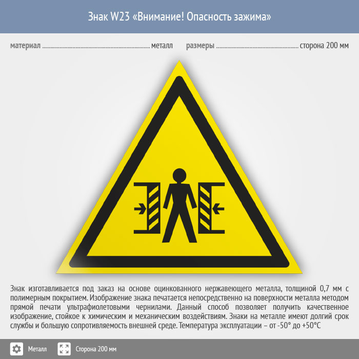 Знак W23 «Внимание! опасность зажима» (металл, сторона 200 мм) в Омске купить