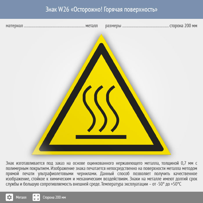 Знак W26 «Осторожно! горячая поверхность» (металл, сторона 200 мм) в Омске купить