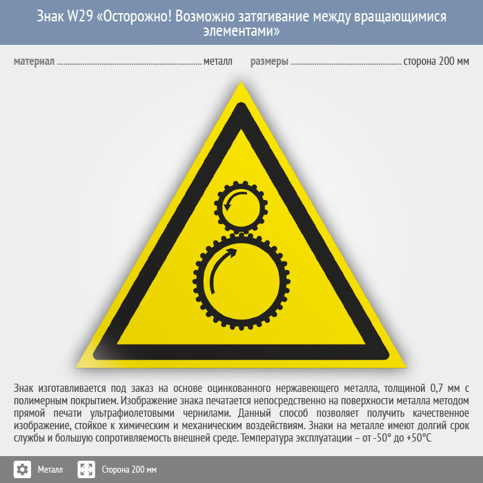 Знак W29 «Осторожно! возможно затягивание между вращающимися элементами» (металл, сторона 200 мм) в Омске купить