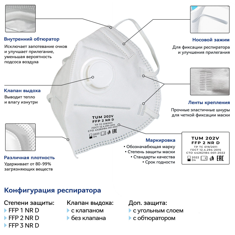 Респиратор противоаэрозольный TUM 202С (FFP2) с угольным слоем, к-т 10 шт в Омске купить