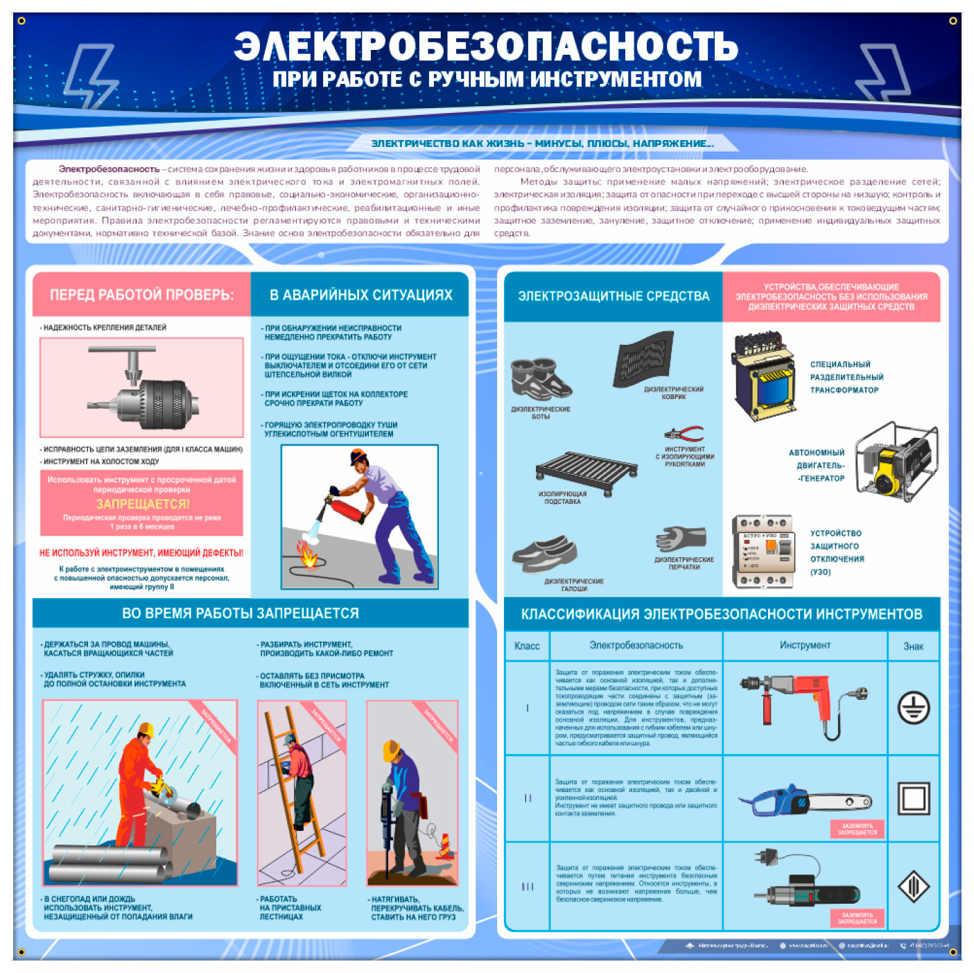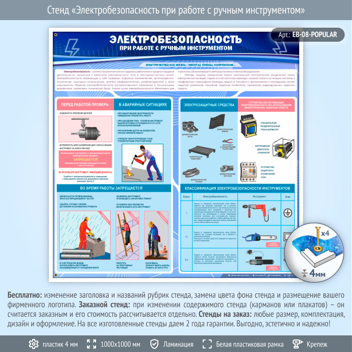Стенд «Электробезопасность при работе с ручным инструментом» – полезная информация при работе с электроинструментом: что нужно проверить перед началом работы и что делать в аварийных ситуациях, какие средства защиты нужно использовать и что запрещается делать во время работы. Приведена классификация электроинструмента