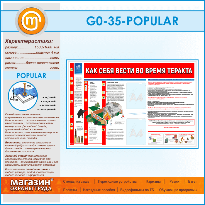 Стенд «Как себя вести во время теракта» научит читателя тому, на что следует обращать внимание на улице – отличать подозрительные предметы, как себя вести в случае стрельбы или взрыва на улице. Что делать, если ты попал в переделку – оказался заложником или в перепуганной толпе, как вести себя, если начался пожар или произошел взрыв в помещении. Приведена инструкция о действиях при обнаружении объектов, похожих на взрывное устройство. На стенде также расположены 2 плоских кармана А4 формата для сменной информации