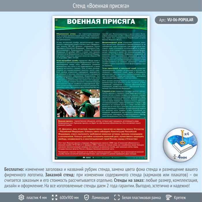 Стенд «Военная присяга» (VU-06) содержит текст военной присяги, а также общевойсковые уставы (устав внутренней службы, дисциплинарный устав, устав гарнизонной и караульной службы, строевой устав).