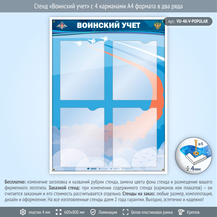 Стенд «Воинский учет» с 4 карманами А4 формата в два ряда (VU-4K-V) предназначен для самостоятельного размещения информации – от документов, приказов и инструкций до рекламы... Часто на таких стендах размещают контактные данные, образцы заполняемых бланков, график работы, порядок приема документов в организации и прочее.