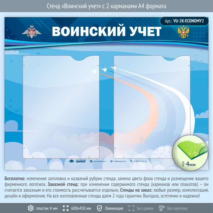 Стенд «Воинский учет» с 2 карманами А4 формата (VU-2K-ECONOMY2) в Омске купить