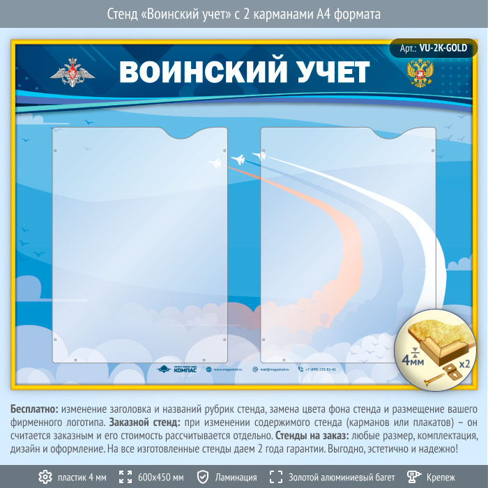 Стенд «Воинский учет» с 2 карманами А4 формата (VU-2K-GOLD) в Омске купить
