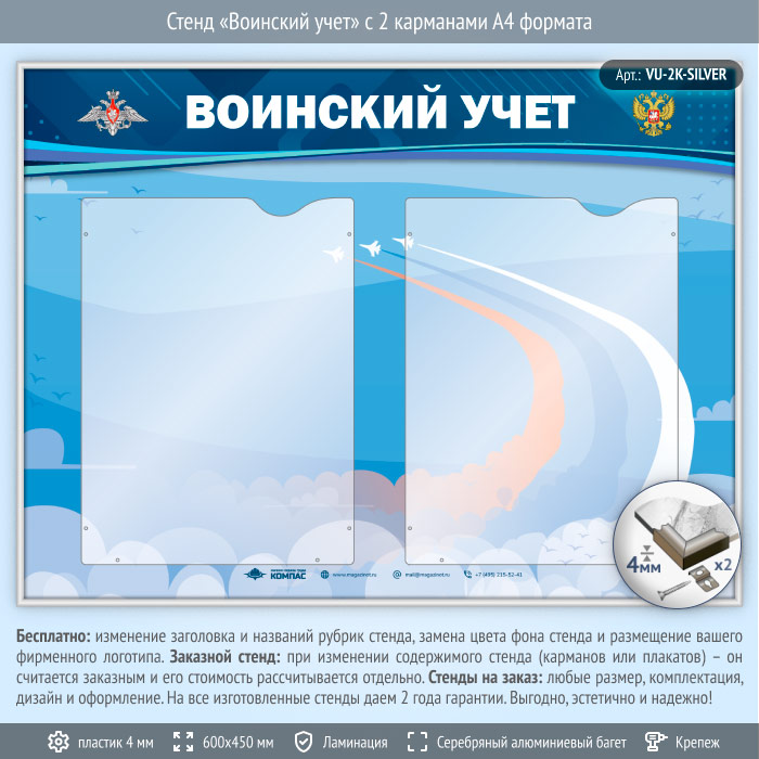 Стенд «Воинский учет» с 2 карманами А4 формата (VU-2K-SILVER) в Омске купить