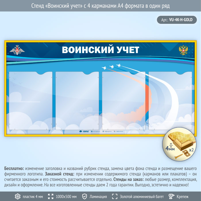 Стенд «Воинский учет» с 4 карманами А4 формата в один ряд (VU-4K-H-GOLD) в Омске купить