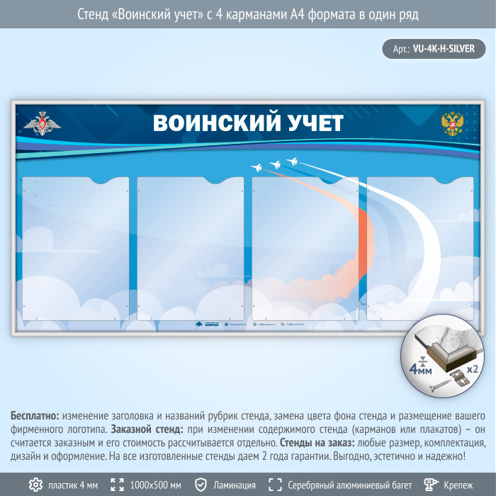 Стенд «Воинский учет» с 4 карманами А4 формата в один ряд (VU-4K-H-SILVER) в Омске купить