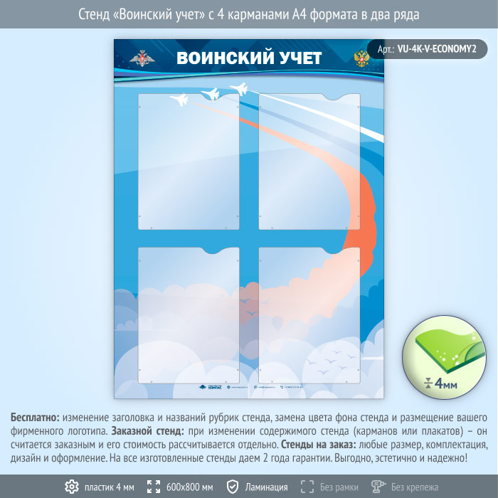 Стенд «Воинский учет» с 4 карманами А4 формата в два ряда (VU-4K-V-ECONOMY2) в Омске купить