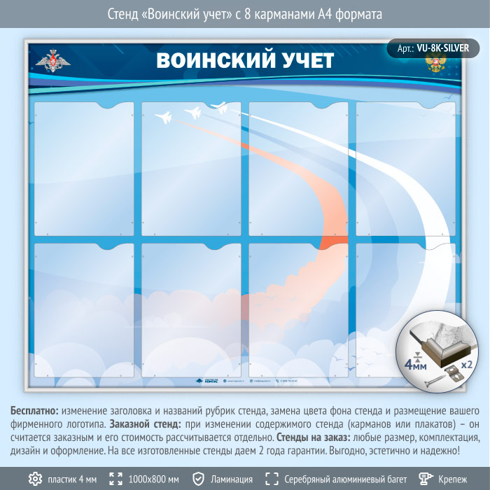 Стенд «Воинский учет» с 8 карманами А4 формата (VU-8K-SILVER) в Омске купить
