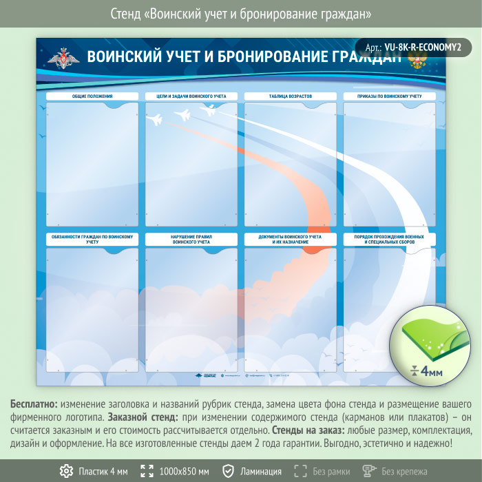 Стенд «Воинский учет и бронирование граждан» с 8 карманами А4 формата (VU-8K-R-ECONOMY2) в Омске купить