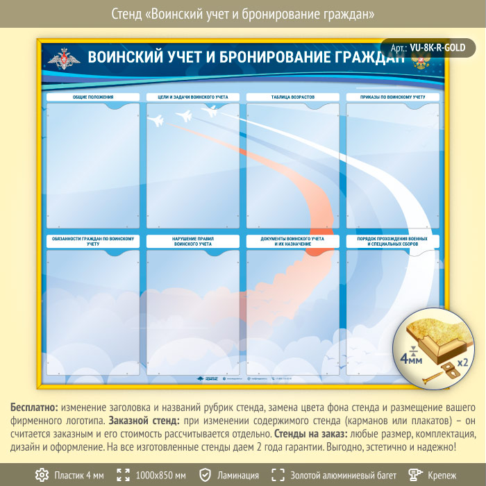 Стенд «Воинский учет и бронирование граждан» с 8 карманами А4 формата (VU-8K-R-GOLD) в Омске купить