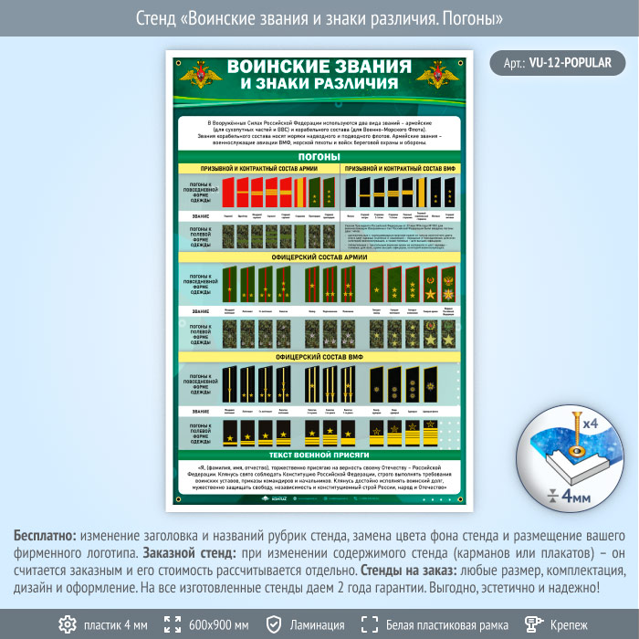 Стенд «Воинские звания и знаки различия. Погоны» (VU-12-POPULAR) в Омске купить