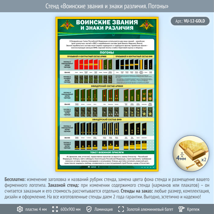 Стенд «Воинские звания и знаки различия. Погоны» (VU-12-GOLD) в Омске купить