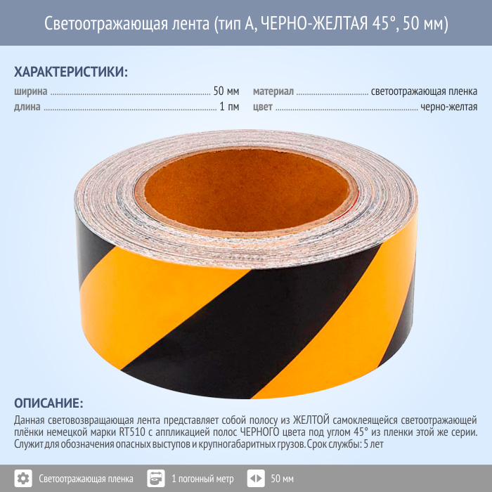 Светоотражающая сигнальная лента (тип А, ЧЕРНО-ЖЕЛТАЯ 45°, 50 мм х 1 п.м.) в Омске купить