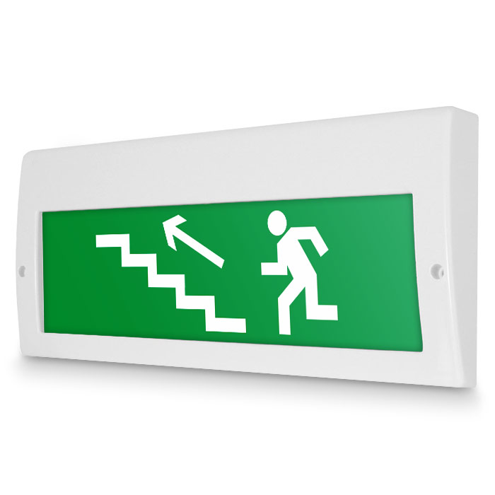 Световое табло «Направление к эвакуационному выходу по лестнице вверх (левосторонний)», Молния (220В РИП) в Омске купить