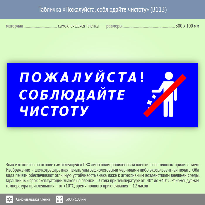Знак (табличка) «Пожалуйста, соблюдайте чистоту» имеет размер(ы): 300х100 мм, 600х200 мм, но может быть изготовлен(а) любого размера на самоклеящейся пленке, пластике толщиной 0.5, 2 или 4 мм и металле. Также возможно применение фотолюминесцентных и световозвращающих материалов