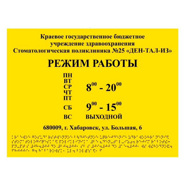 Тактильная вывеска с дублированием азбукой Брайля, ДС10 (полистирол 3 мм, 600х500 мм)