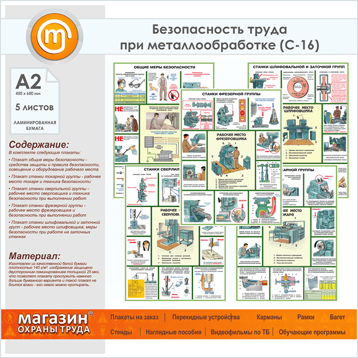 Плакат «Безопасность работ на металлообрабатывающих станках» (С-16, ламинированная бумага, А2, 5 листов) в Омске купить