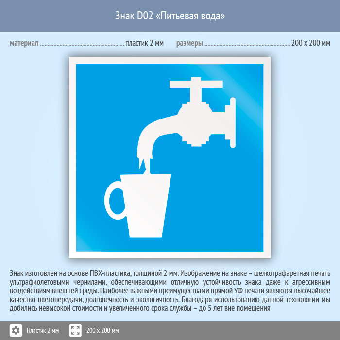 Знак D02 «Питьевая вода» (пластик, 200х200 мм) в Омске купить