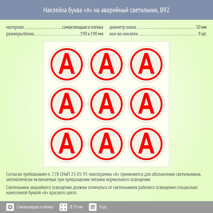 Наклейка буква «А» на аварийный светильник, B92 (пленка, диаметр 50 мм, блок 9 штук, 190х190 мм) в Омске купить