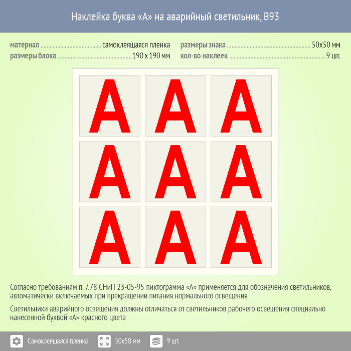 Наклейка буква «А» на аварийный светильник, B93 (пленка, 50х50 мм, блок 9 штук, 190х190 мм) в Омске купить