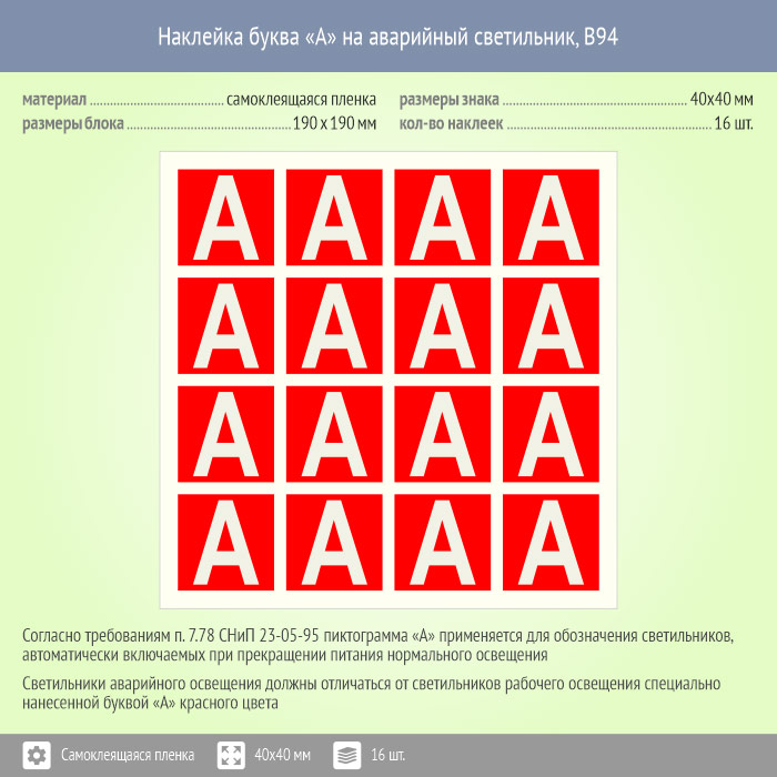 Наклейка буква «А» на аварийный светильник, B94 (пленка, 40х40 мм, блок 16 штук, 190х190 мм) в Омске купить
