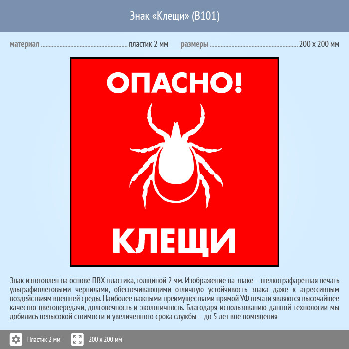 Знак «Опасно! Клещи», B101 (пластик, 200х200 мм) в Омске купить