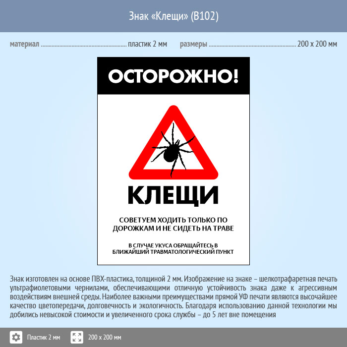 Знак «Осторожно! Клещи», B102 (пластик, 400х600 мм) в Омске купить