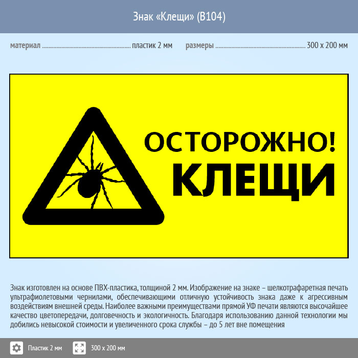 Знак «Осторожно! Клещи», B104 (пластик, 400х300 мм) в Омске купить