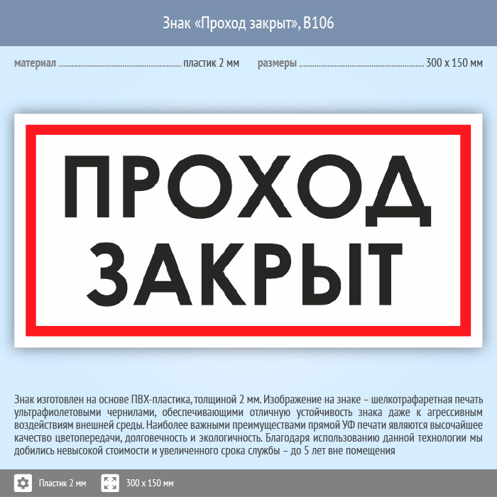 Знак «Проход закрыт», B106 (пластик, 300х150 мм) в Омске купить