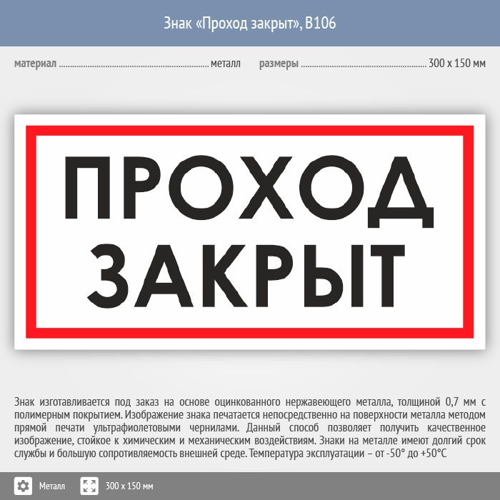 Знак «Проход закрыт», B106 (металл, 300х150 мм) в Омске купить
