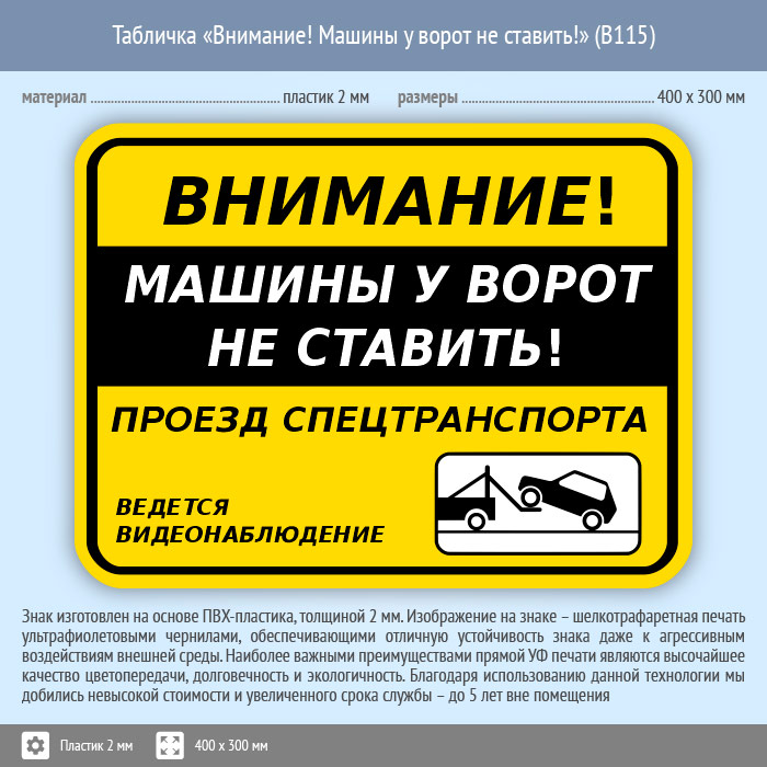 Табличка «Внимание! Машины у ворот не ставить!», B115 (пластик, 400х300 мм) в Омске купить
