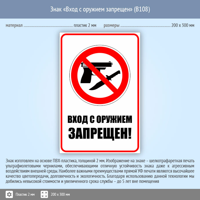 Знак «Вход с оружием запрещен», B108 (пластик, 200х300 мм) в Омске купить