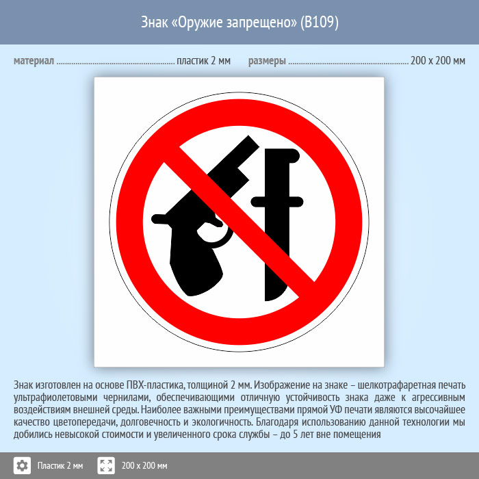 Знак «Оружие запрещено», B109 (пластик, 200х200 мм) в Омске купить