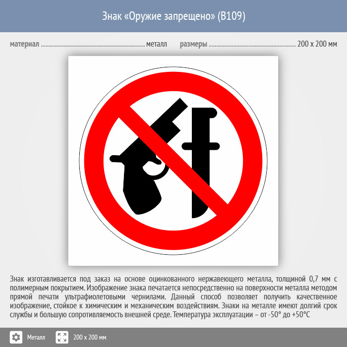 Знак «Оружие запрещено», B109 (металл, 200х200 мм) в Омске купить